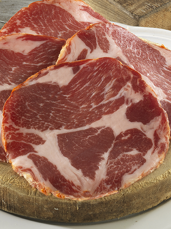 Derivata dal sottocosta inferiore dei suini, la pancetta arrotolata ha un aspetto roseo al taglio, con striature sottili di magro e di grasso.